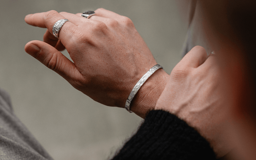 Der Ring zeigt getragen futuristische Tiefe und meteoritenartige Struktur die maennliche Praesenz und modernen Look betont Sprezzi FashionDer asymmetrische Bandring aus massivem 925 Sterling Silber zeigt eine markant handgefertigte meteoritenartige Oberflaeche mit rauer moderner Struktur die kraftvolle Praesenz und anspruchsvolles Design verbindet und als starkes Statement fuer maennlichen Stil hervorsticht Sprezzi Fashion